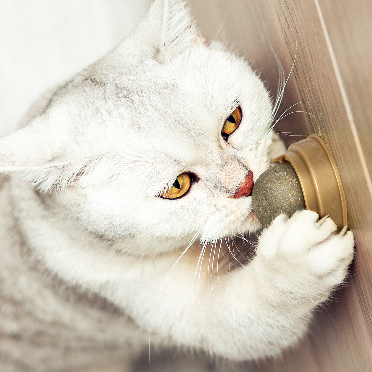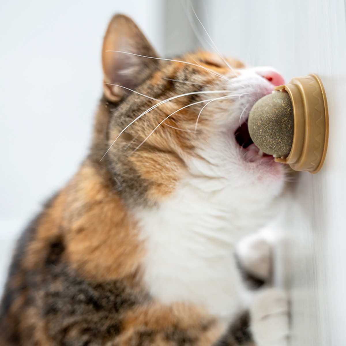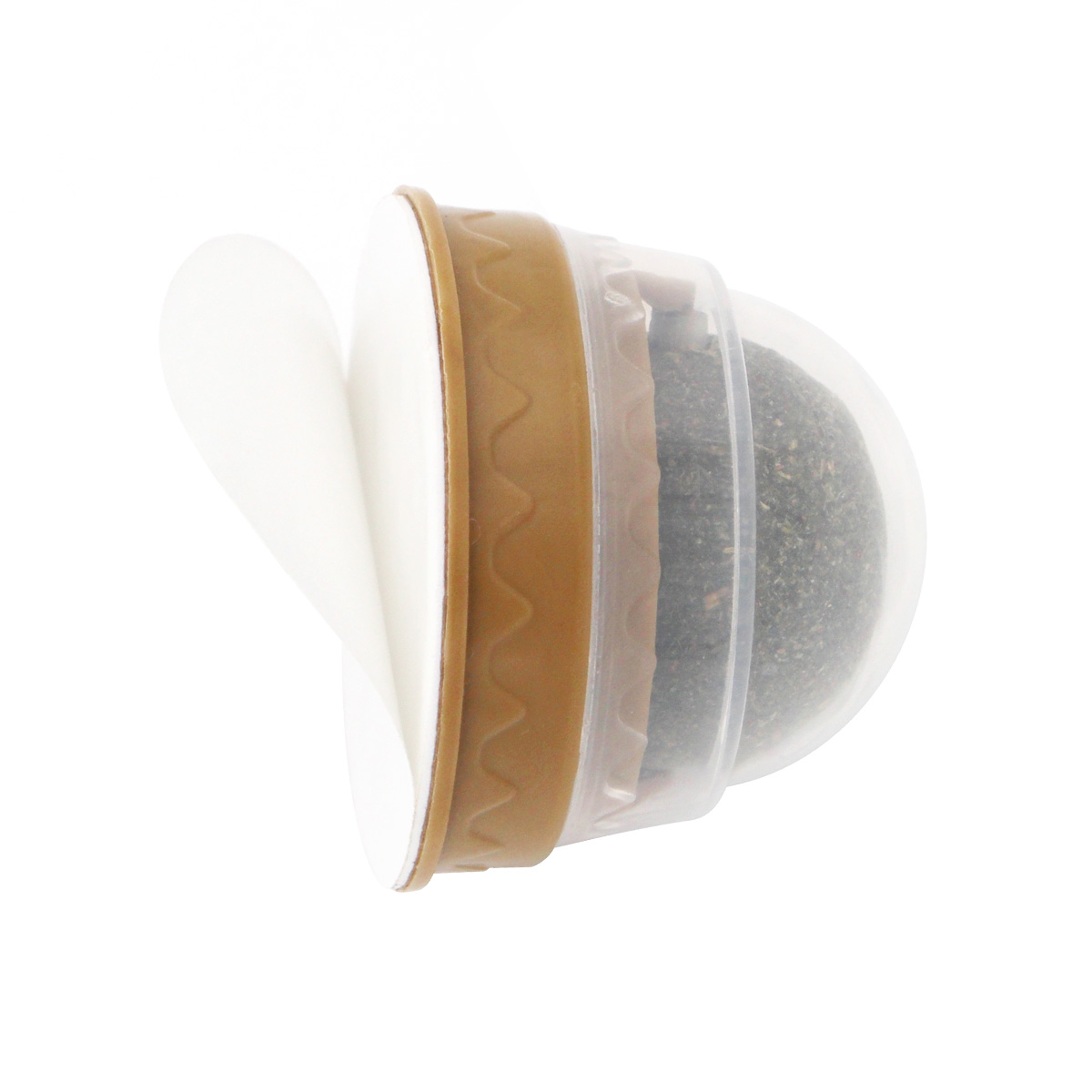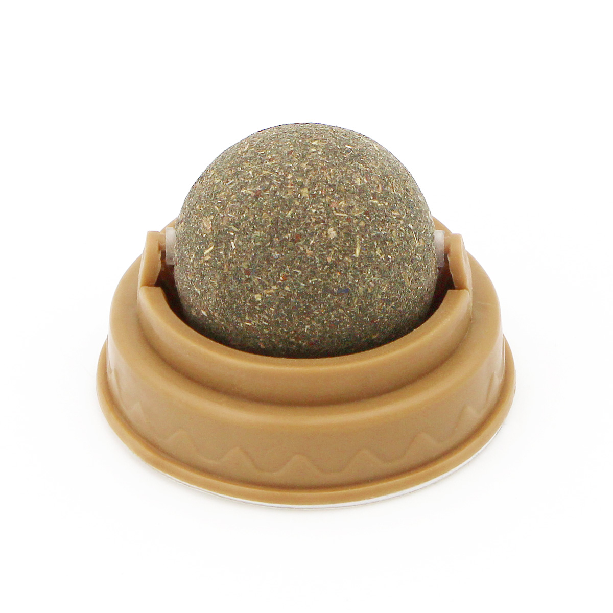 Fixée sur un socle adhésif robuste, la boule tourne à 360°, permettant au chat de la lécher, frotter ou mordiller à sa guise.