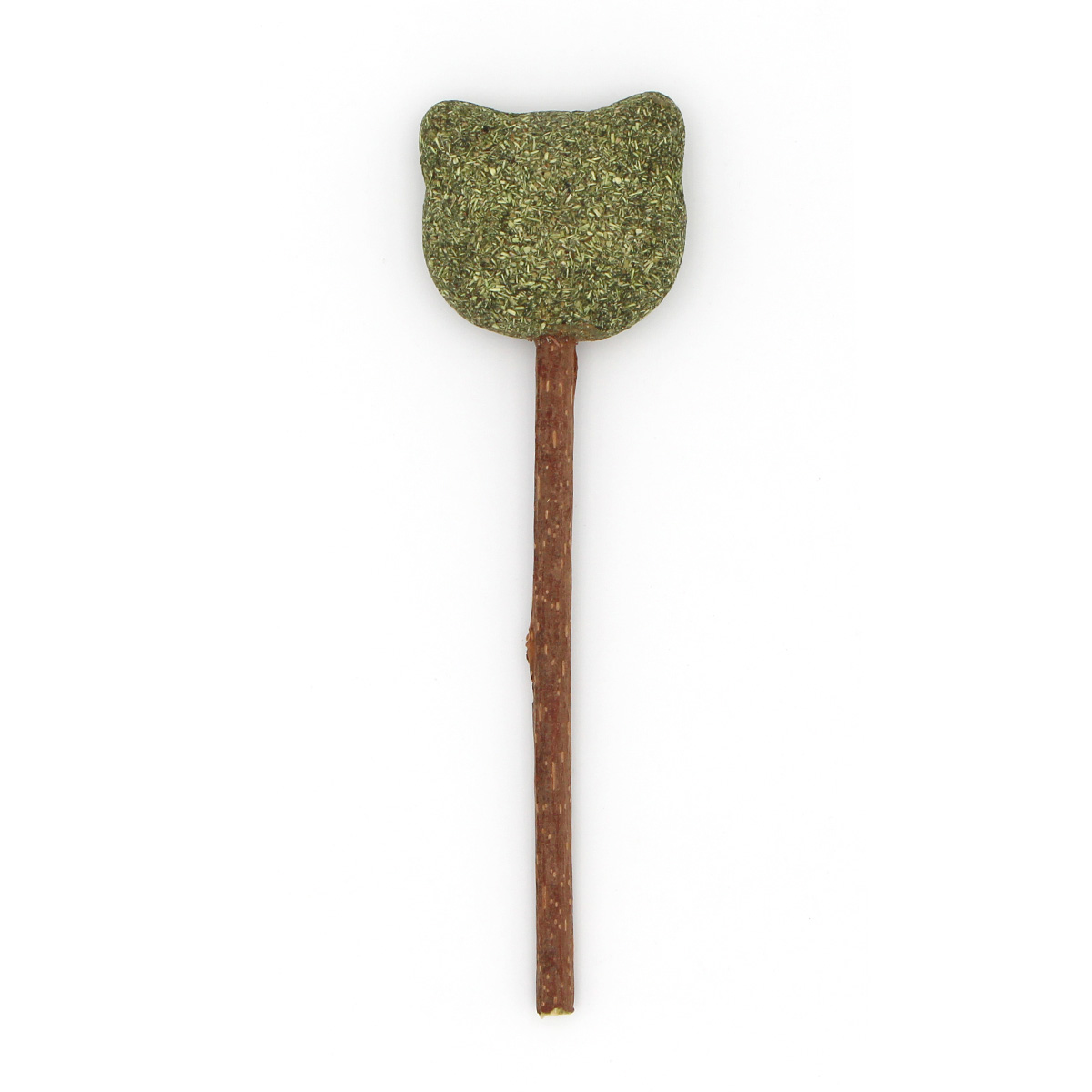 Cette sucette naturelle et ludique en forme de tête de chat allie deux plantes très appréciées des félins : la cataire et le matatabi. La partie supérieure, en forme de tête de chat, est constituée de cataire séchée et compactée, tandis que le manche est un bâton de matatabi séché.