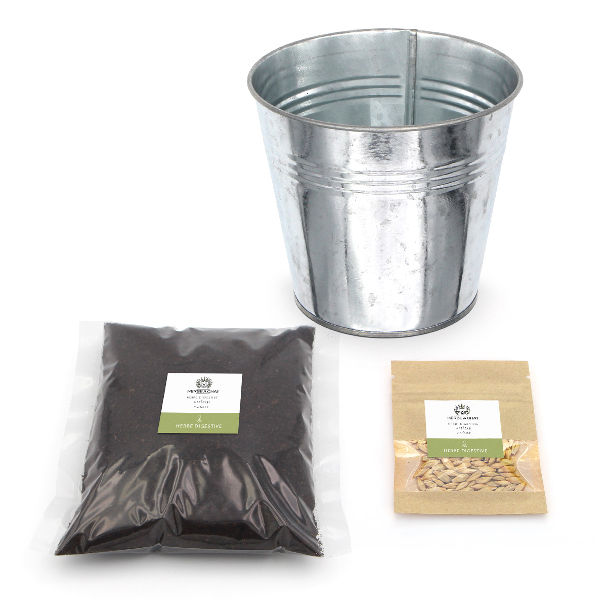 Alliez design épuré et bien-être félin avec ce kit d’herbe à chat digestive à semer présenté dans un pot en zinc brillant.
