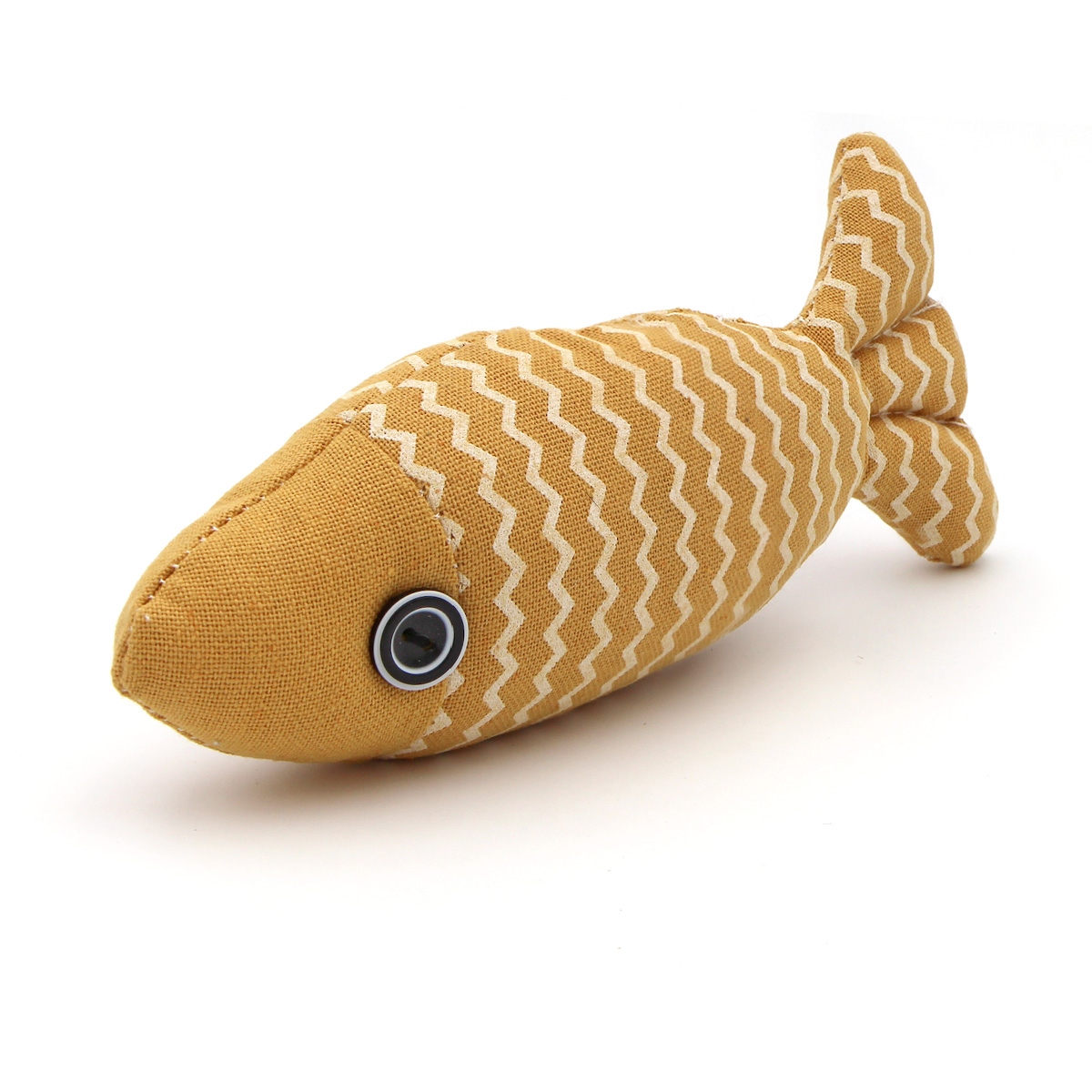 Ce poisson en tissu coloré est garni de ouate imprégnée de cataire (Nepeta cataria), une plante aromatique appartenant à la famille des Lamiacées, connue pour son effet euphorisant et stimulant sur les chats.