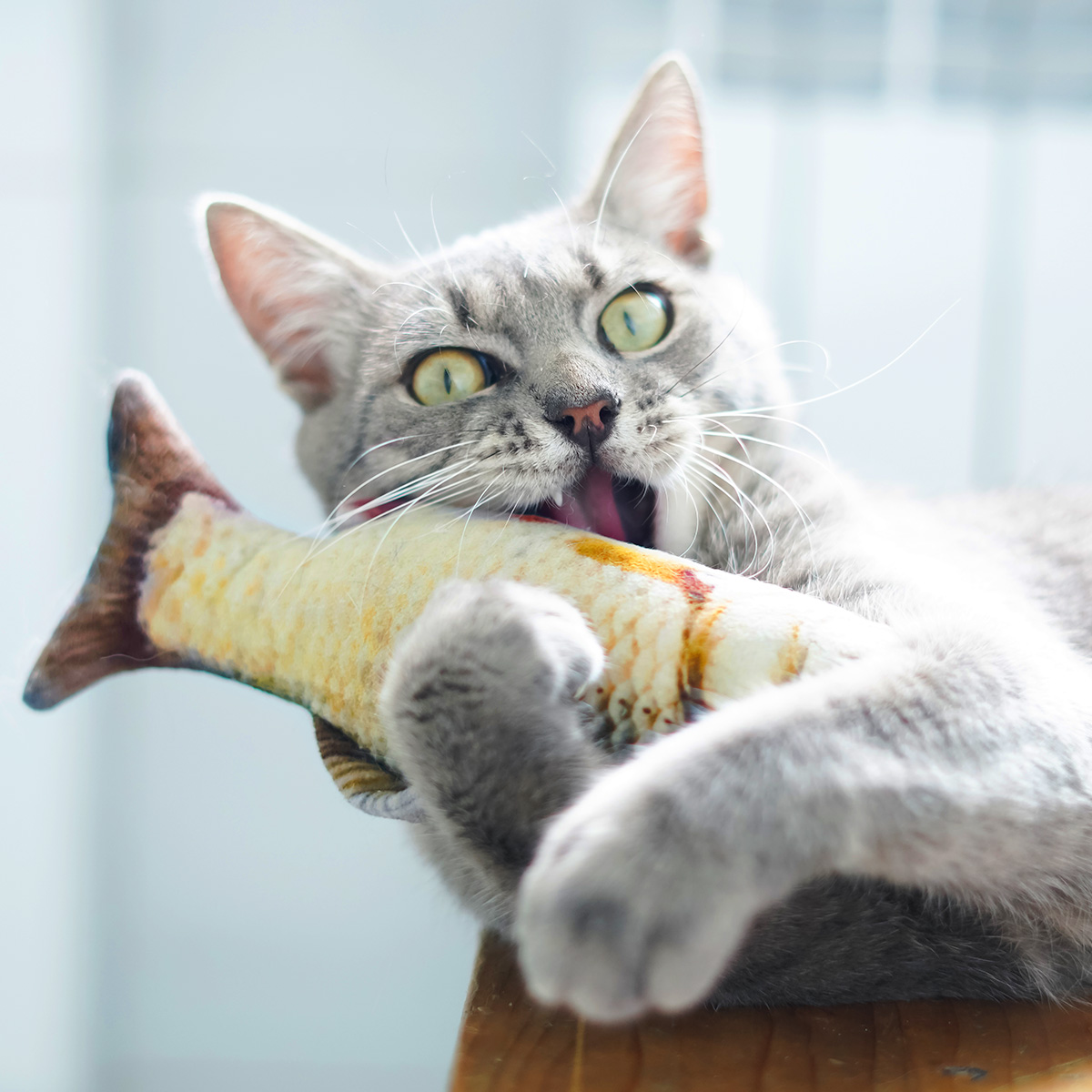 Le poisson est garni de ouate douce et légère, permettant à votre félin de le mordiller, le griffer ou le câliner à volonté.
