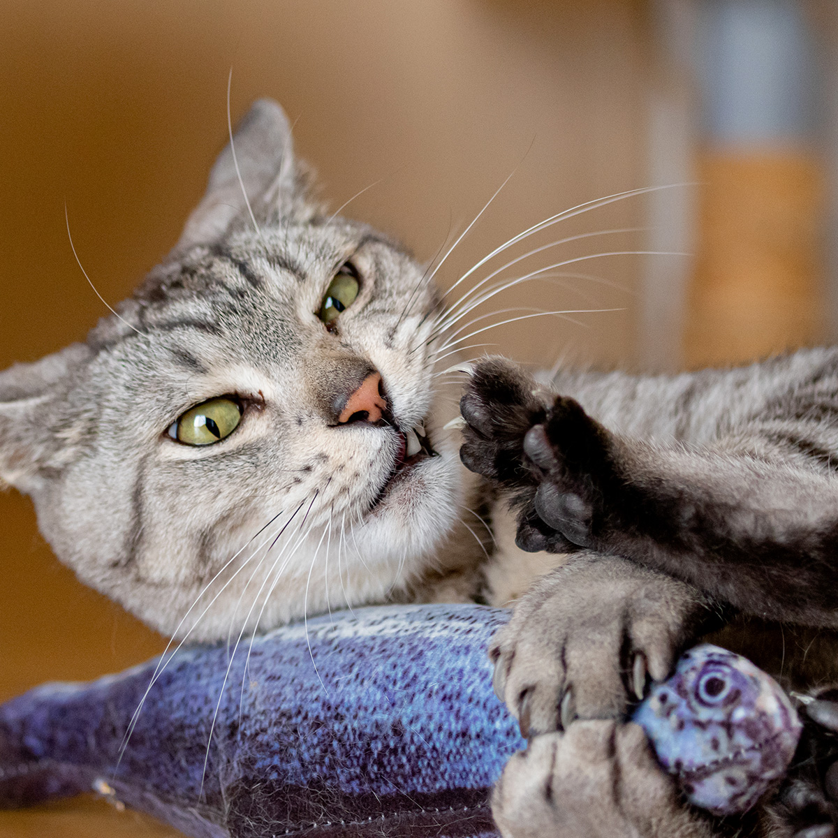 Ce poisson en forme de saumon réaliste attire immédiatement l’attention du chat grâce à son parfum de cataire (Nepeta cataria), une plante naturelle réputée pour ses effets stimulants et euphorisants.